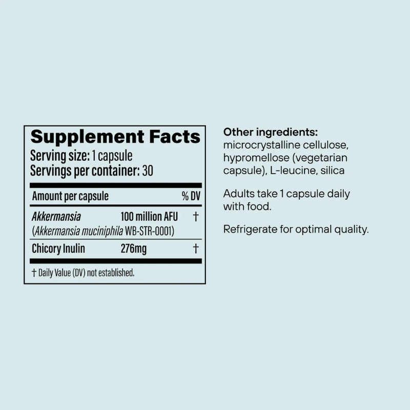 - Live Akkermansia muciniphila – 100 million AFU (Anaerobic Forming Units) per capsule.