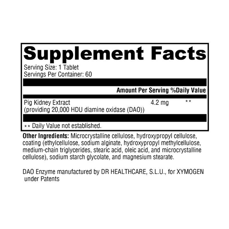 - DAO Enzyme Activity: The active ingredient in HistDAO™ is porcine-derived diamine oxidase (DAO), which degrades histamine from dietary sources in the small intestine. DAO converts histamine to an inactive metabolite, reducing histamine-related discomfort.