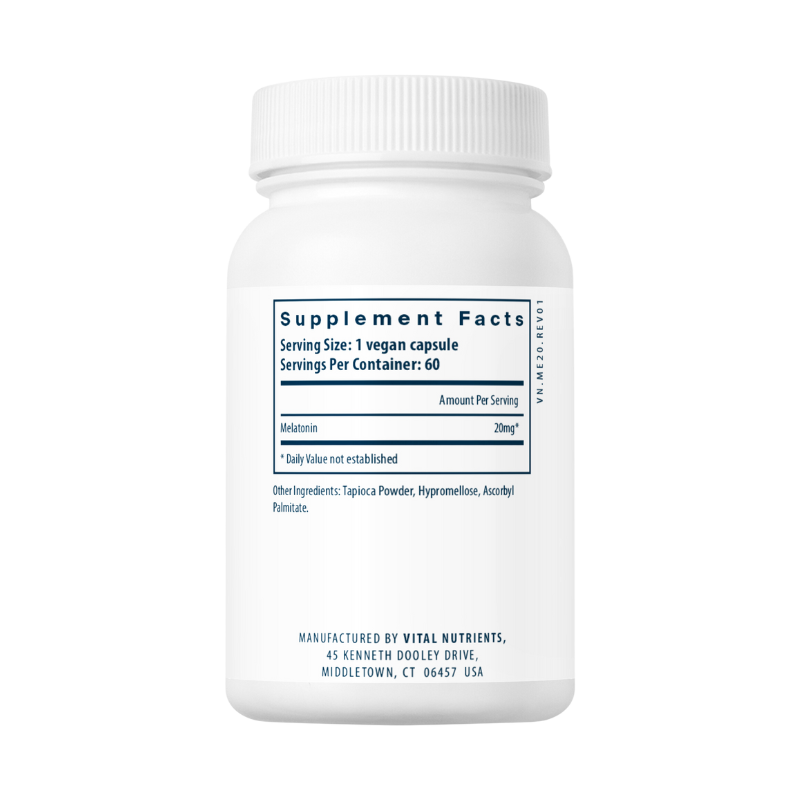 Vital Nutrients' Melatonin 20 mg is a premium dietary supplement designed to support the body's natural sleep-wake cycle. Melatonin, a hormone produced by the pineal gland, plays a crucial role in regulating sleep patterns and maintaining biological rhythms.