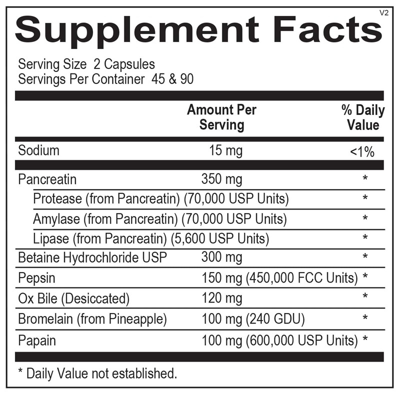 - Pancreatin – 350 mg (Protease, Amylase, Lipase)